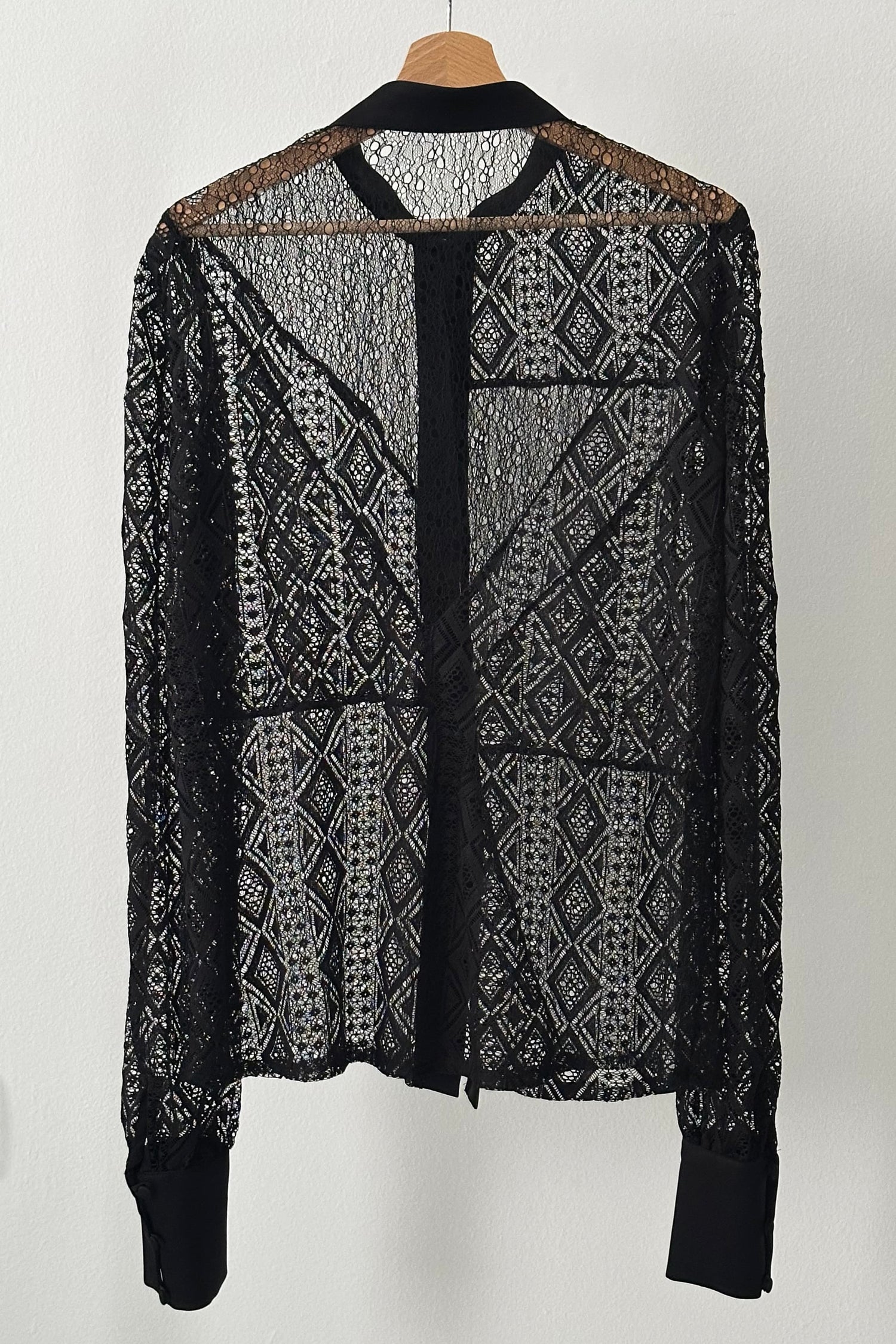 The Bellatrix Lace Shirt will not leave you unnoticed. Two different laces, a geometric design, and a satin Mao neck with black covered buttons along the front will make you feel elegant yet unique. A special design that pairs perfectly with everything from our collection.