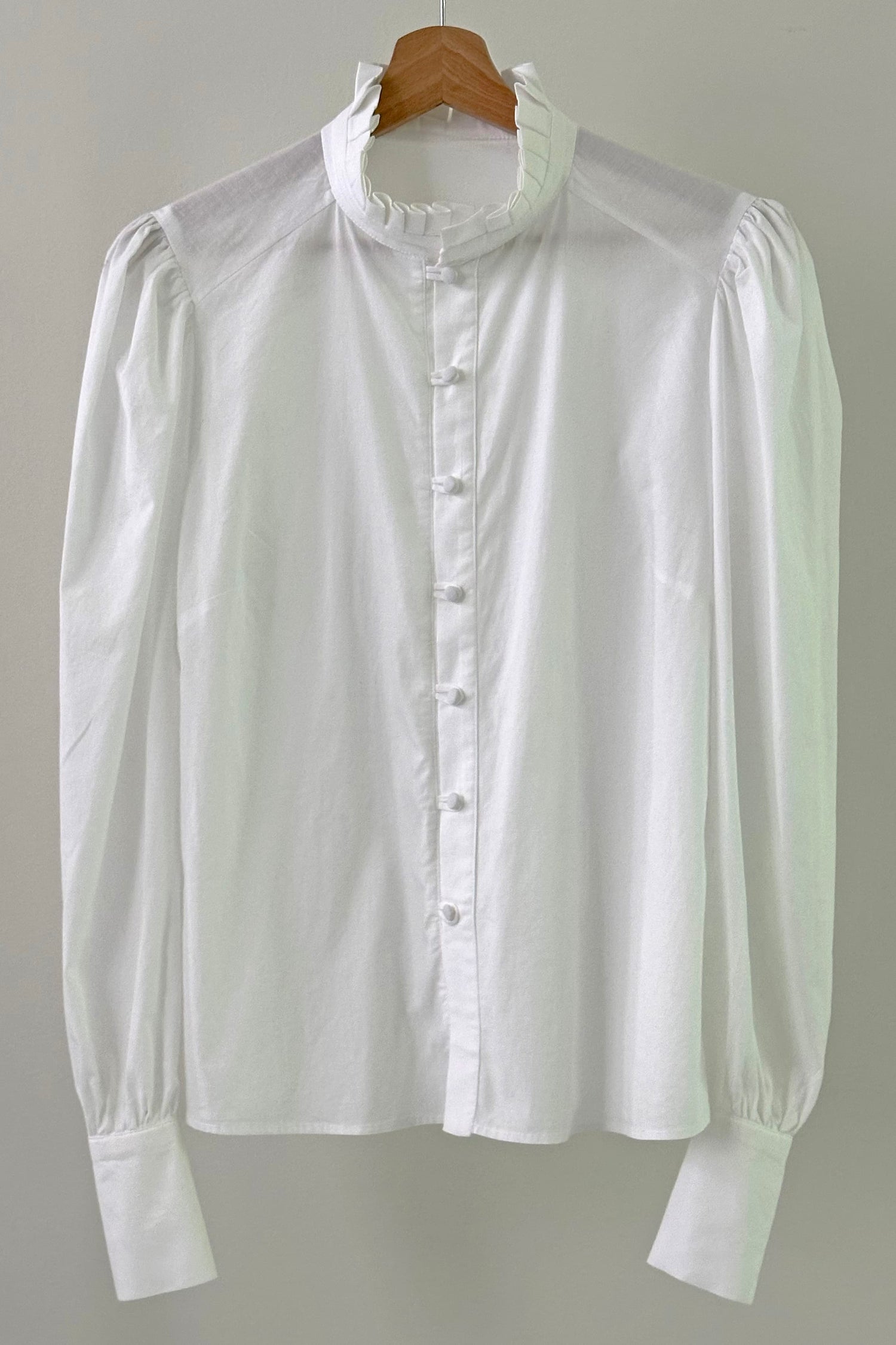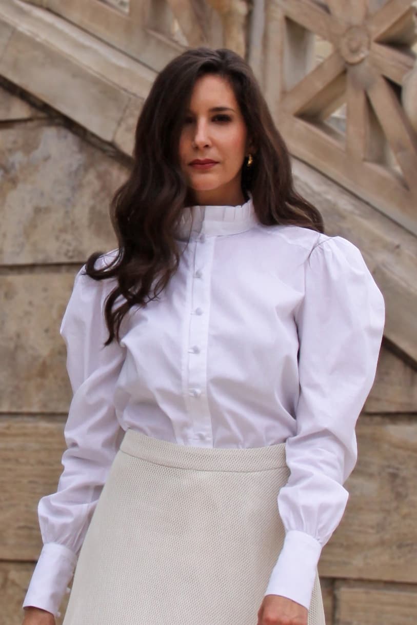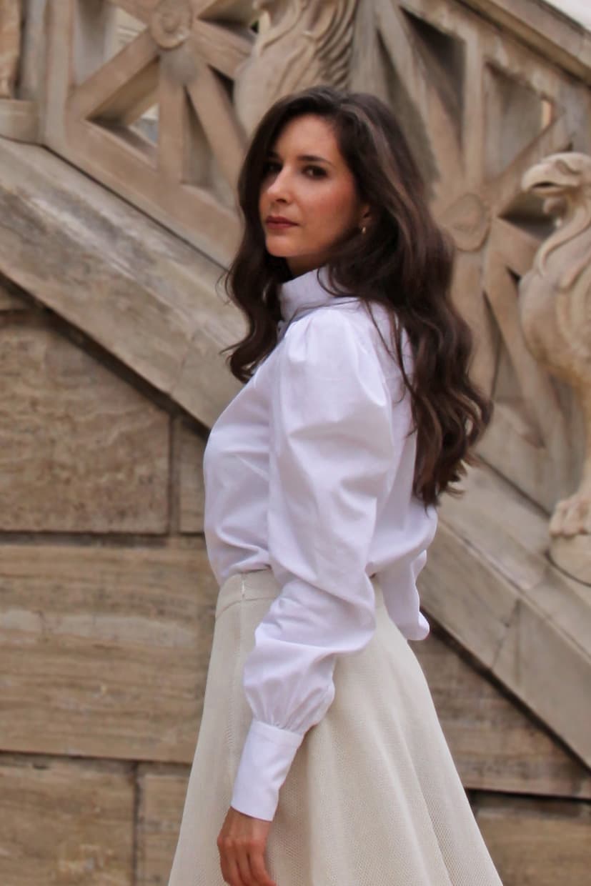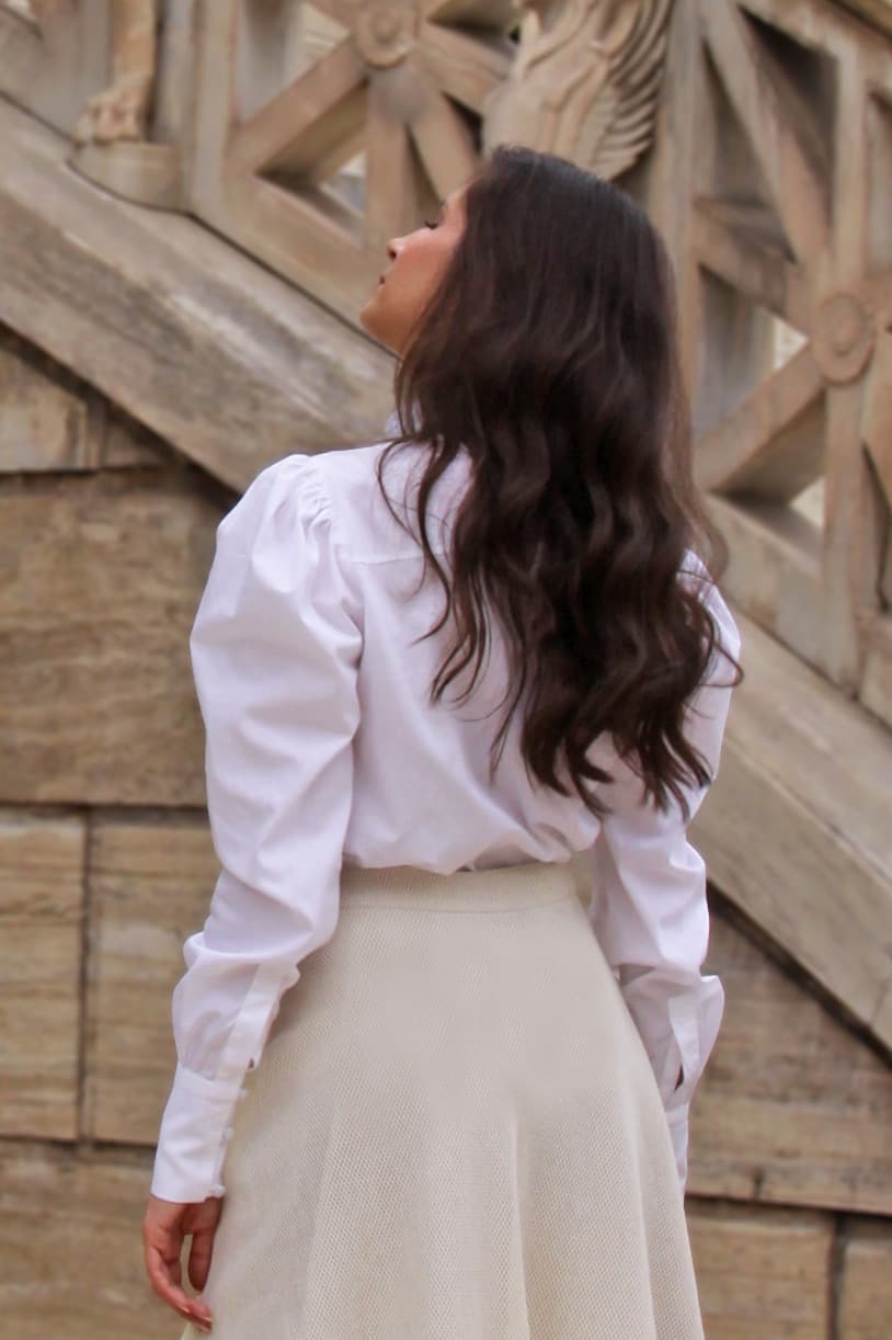 The Calista White Shirt wil not you leave you unnoticed. Special voluminous sleeves, pleats on the neck with covered buttons dotting the front and beige color will make you feel elegant but also unique. A special design that works perfectly with everything from our collection.